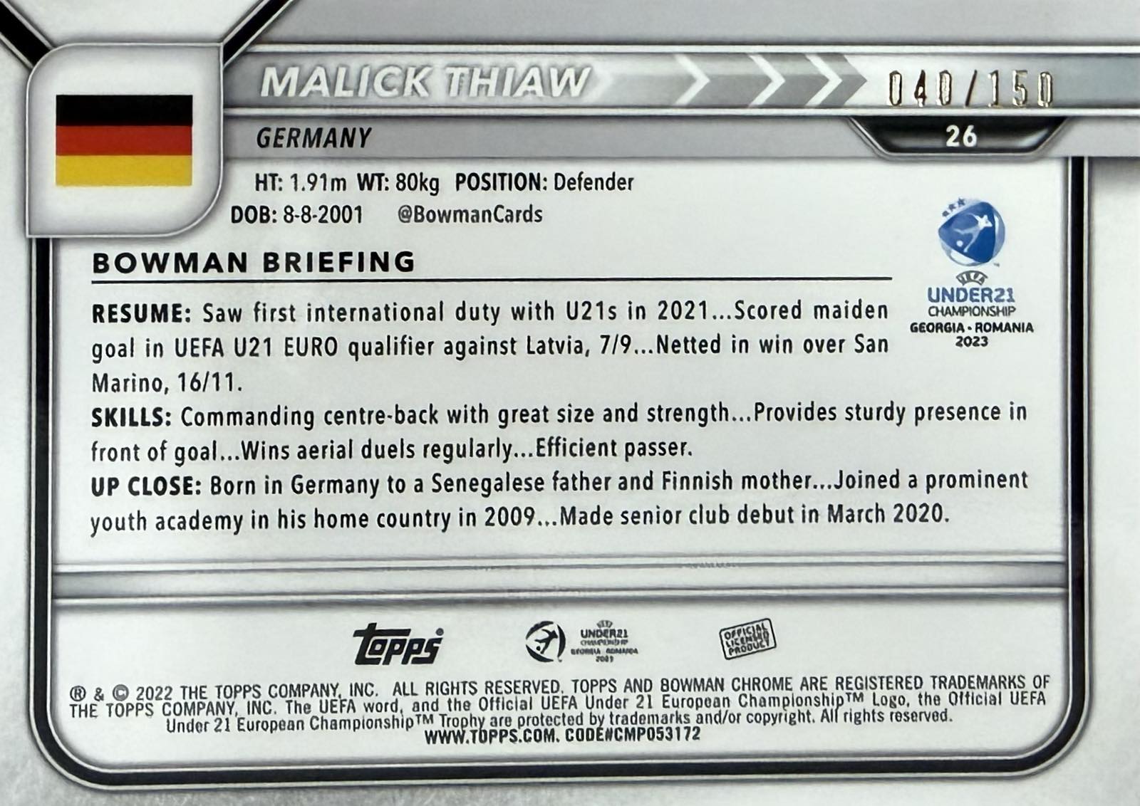 Malick Thiaw Numbered /150 Bowman Chrome